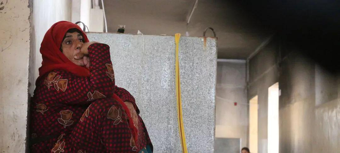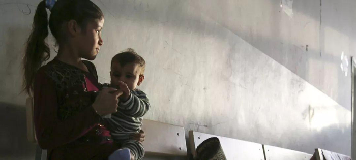 粮食署图片 | 叙利亚东北部的哈塞克省,一位母亲坐在用作临时避难所的校舍内