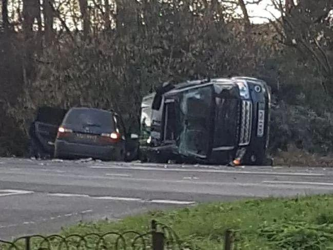 事故看起来非常可怕:菲利普亲王的路虎侧翻在路边,对面司机都骨折了。