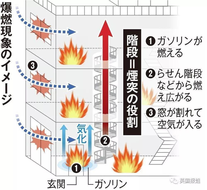 但在大火现场,这台阶梯成为了火焰迅速蹿升的渠道。消防人员把这种现象叫做“烟囱效应”:户内空气沿着有垂直坡度的空间向上升或下降,造成空气加强对流的现象。若是没有这个楼梯,火势从一楼往上蔓延的速度就不会这么迅速。