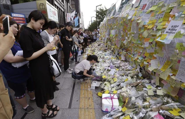 “因为是女人,所以被杀害”,江南站出口贴满了哀悼被害人的便贴纸,大部分表达了对因身为女性而遭受暴力的抗议和悲伤:“我今天偶然活了下来”。