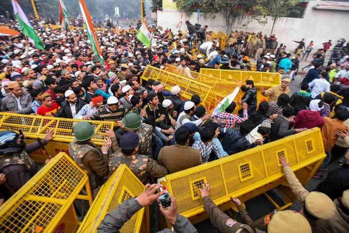 △ 2019年12月20日,印度新德里举行的反对《公民身份法》修正案的抗议活动中,示威者越过警察路障。