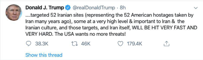 美国总统特朗普也毫不示弱,他在自己的社交媒体账号中写道,“…瞄准52个伊朗的目标(这代表上世纪70年代末80年代初发生的人质事件中,被劫持的美国人数量),其中有一些对伊朗以及伊朗的文化有着极其重要的意义。这些目标会以很快的速度被击中。美国不希望有更多的威胁了!”;他还在转发时写道,“他们(伊朗)攻击我们,我们就会回击。”