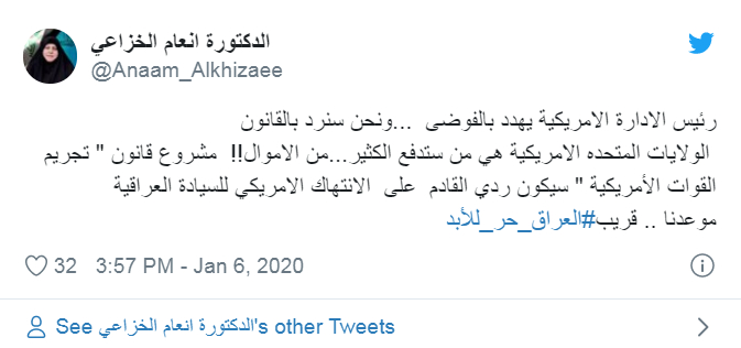 希泽伊写道:“美国政府威胁要制造混乱,我们将依法作出回应……我对美国侵犯伊拉克主权(行为)的下一个回应将是对美国军队采取法律行动”。