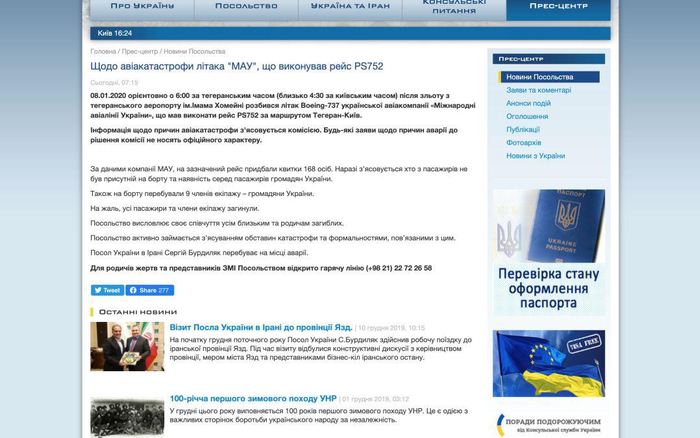 当地时间下午一点左右,乌克兰驻伊朗使馆网站更新了其新版声明,其中删掉了将事故原因定为技术故障、“已排除恐怖袭击和导弹攻击”的措辞,而改成了“关于事故原因的信息将由委员会发布,在委员会决定公布前的任何有关事故原因的声明均不具有官方性质”。