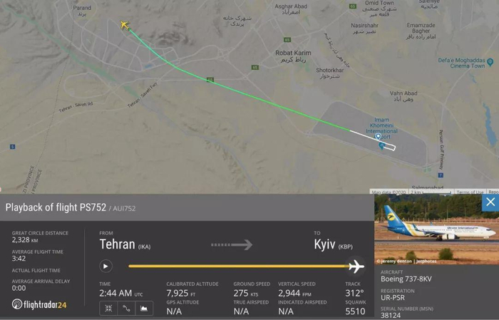 根据航空技术网站FlightRadar24录得的数据,这架波音737在当地时间5点42分从德黑兰起飞,目的地是乌克兰首都基辅。它最后一次返回雷达数据是5点44分——在这之后,它就从雷达显示屏上消失了。