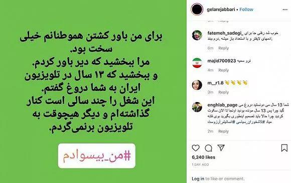 伊朗知名主播贾巴里(Gelare Jabbari)在社交媒体Instagram上公开宣布辞职,并表示自己替政府“说了13年谎”,为此请求原谅。
