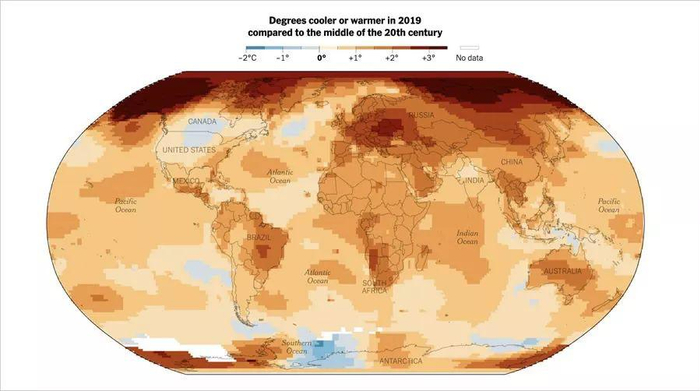 《纽约时报》做的这张图比较了2019年全球各地与20世纪中期相比的温度变化。你可以看到,全球大多数地区的温度上升范围都在1-2度之间,那些暗红色的地方更是达到了3度以上。