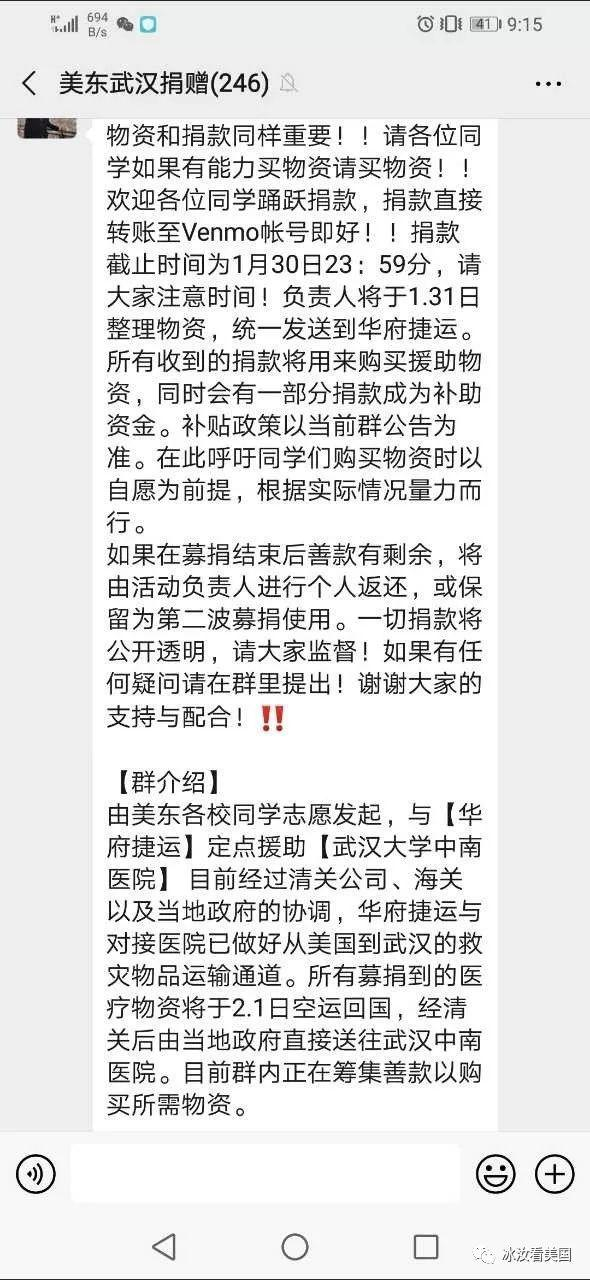 我先是加了一个美东大华盛顿地区对武汉的捐赠群,将自己寒假打工赚取的钱,留了一个月房租后基本全部捐出了。