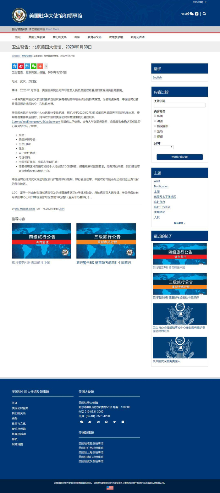 1月30日,美国国务院再次调高了对中国的旅游警告,将对整个中国的旅游警告升高到第四级:请勿前往。