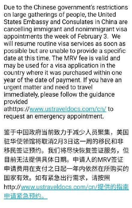 邮件中说:鉴于中国当前致力于减少人员聚集,美国驻华使领馆将取消2月3日这一周的移民和非移民签证预约。我们将尽快恢复签证服务,但目前无法提供具体日期。申请人的MRV签证申请费用在支付之日起一年内依然在所购买的国家有效。如有紧急出行需求,请按照http : //www。 ustraveldocs。 us/cn指南申请紧急预约。