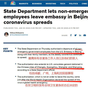 美国国务院表示:“国务院做出让美国大使馆和各地总领馆人员批准离境的决定,是因为新型冠状病毒导致的(中美)交通受阻,和当地医疗服务可能因新型冠状病毒引起的短缺有关。”美国国务院在一份声明中说。