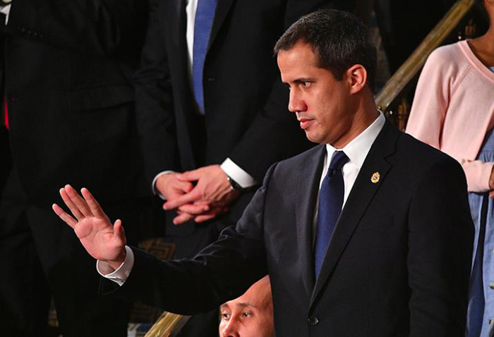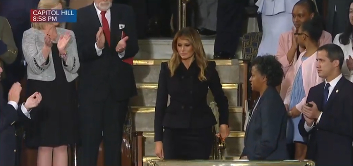 特朗普、第一夫人梅拉尼娅和特朗普内阁成员入场。现场观众中还有委内瑞拉反对派领导人瓜伊多,他在与马杜罗的斗争中得到特朗普支持。