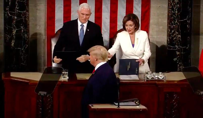 当天的国情咨文,发生了戏剧性的一幕,在演讲开始前,特朗普照例把演讲稿的复印件呈交给了众议院议长佩洛西。现场视频显示,特朗普面无表情,佩洛西一手接过讲稿后,微笑着伸出另一只手,示意要与特朗普握手,但后者立即转过身,给了佩洛西一个后背。佩洛西只得尴尬一笑,收回手。