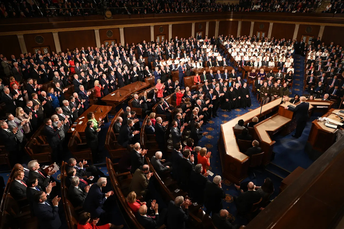 在为时一个半小时的演讲期间,现场民主、共和两党议员之前的对立也多次表现出来。特朗普讲到一些重点内容时,共和党人起立鼓掌,而另一侧的民主党人则端坐不动。期间,还有多名民主党人因不满特朗普的演讲离席而去。