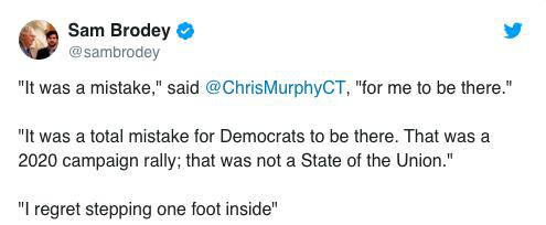 在国情咨文结束后,民主党参议员克里斯·墨菲表示,民主党人参加今天的国情咨文就是个“错误”,自己很后悔踏进会场,他表示这场演讲就像是特朗普的“2020竞选集会”。