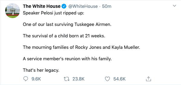 白宫发推特暗批佩洛西撕掉国情咨文,称她撕毁的是“最后幸存的塔斯基吉飞行员之一,一个21周就出生的孩子,洛基·琼斯和凯拉·穆勒在哀悼的家人,一个与家人团聚的军人。这就是她留下的。”