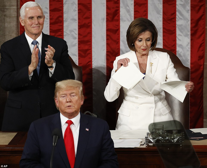 (特朗普讲完后,身后的佩洛西分四次,将特朗普的讲稿复印件撕成两半。)