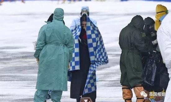 一支戴着塑料防护服和防毒面具的警察和军官组成的车队在机场迎接他们,下飞机第一件事,先消毒。