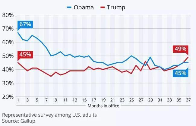 最新的民调显示,特朗普总统的民意支持率,从弹劾案启动前的38%猛增到了49%,近半数的美国选民认可特朗普的执政表现——这个支持率已经和2012年谋求连任的奥巴马持平了。