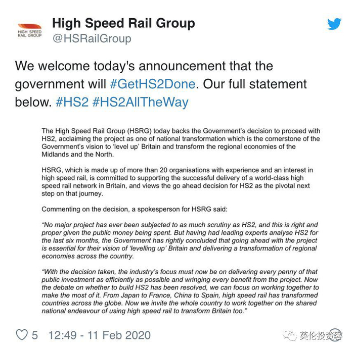 另外,英国高铁集团也发布官方声明,对首相的决定表示了欢迎。