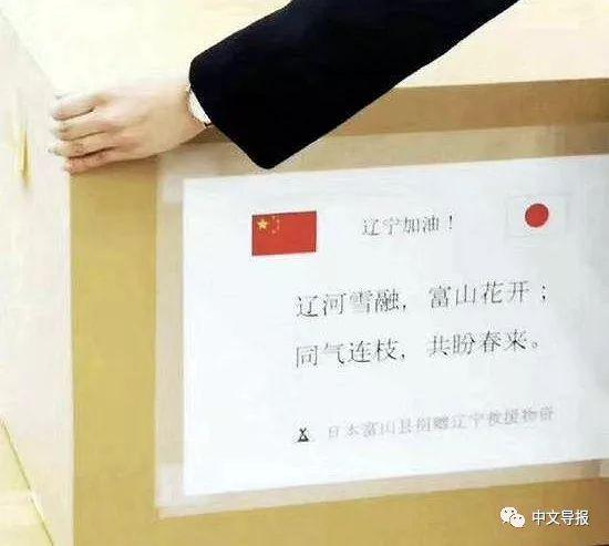 日本富山县给辽宁省的驰援物资上,贴有“辽河雪融,富山花开;同气连枝,共盼春来” 。据悉,这是在富山县工作的中国职员想到的,这首小诗是在此工作的富山县经贸联络官孙肖原创的。