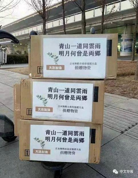 日本舞鹤市驰援大连的物资纸箱上,由在该机构进行交流的一名大连籍华人提出,使用了“青山一道同云雨,明月何曾是两乡”。