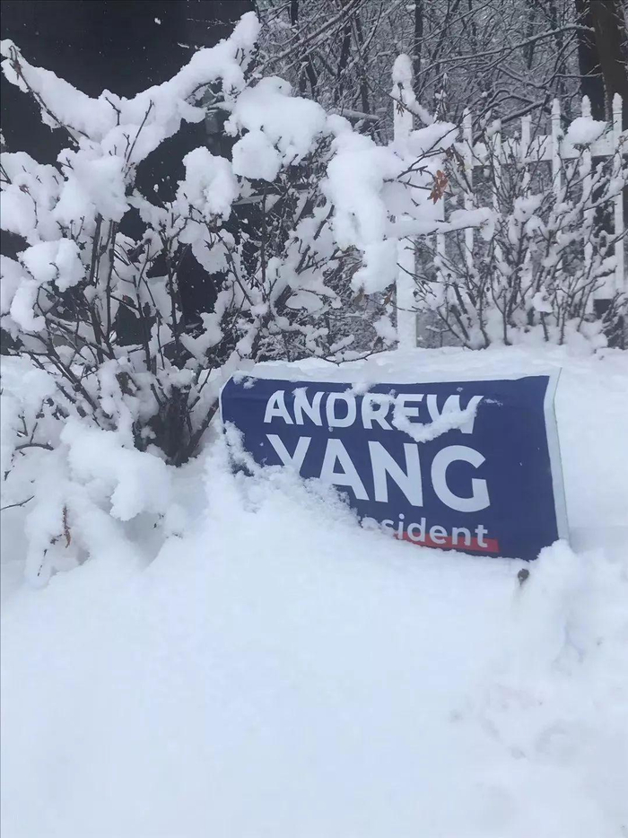 爱荷华州大雪中的杨安泽竞选广告牌。(图片来自杨帮群)