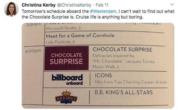 Christina说船上自助餐供应的牡蛎很好吃,她后悔自己没有早点发现这道菜!结果话音刚落,下一条推文是:我越来越绝望了。尽管我完全不吃午餐甜点,但我的体重似乎还在继续增加。(减肥是全世界所有妇女的共同愿望)2月10日:Christina兴奋坏了,因为荷美公司刚刚通知乘客将在三天后抵达泰国曼谷,大家就可以下船回家了。Christina说自己要利用最后三天时间,好好修炼一下花式叠毛巾的技能。