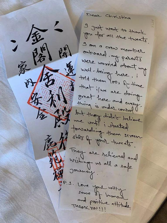 2月12日:这一天Christina一早就被感动坏了。船员给她留了张纸条,上面写道:谢谢你发的推特,我是一名船员,我的父母很担心我。我告诉父母一切都很好,但是他们不相信。于是我让他们去看你的推文,他们才被说服了。我很欣赏你乐观的态度,谢谢!