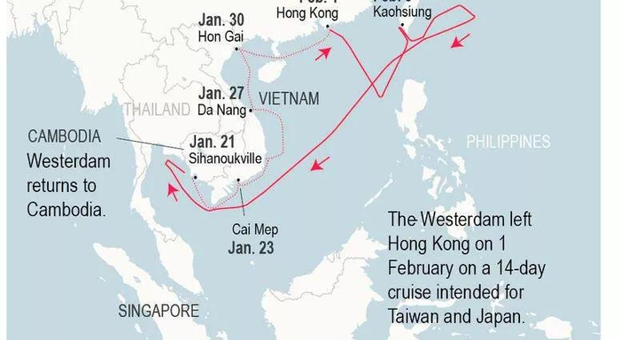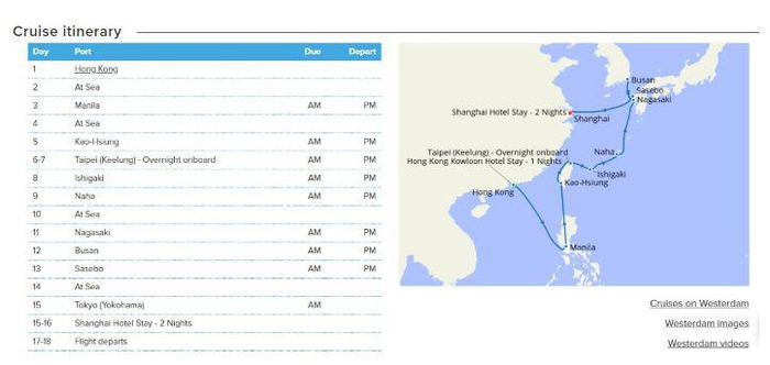 威士特丹号从荷兰鹿特丹出发,1月30日抵达香港。2月1日从香港再启航,当时船上原有687乘客继续旅程,另外有约800名乘客从香港上船,邮轮共载有2,257人,包括1,455名乘客及802位工作人员。按照原计划,从香港出发后他们将前往台湾,日本,韩国和上海。可以想象,刚登船的乘客们对于这次乘坐豪华游轮的亚洲行一定是很兴奋的。但好景不长,在海上才漂了两天,2月3日,威士特丹号发现自己成了太平洋上的一叶孤舟,没有人愿意接受他们停靠。威士特丹号的原定计划是这样的👇: