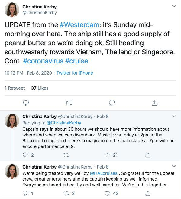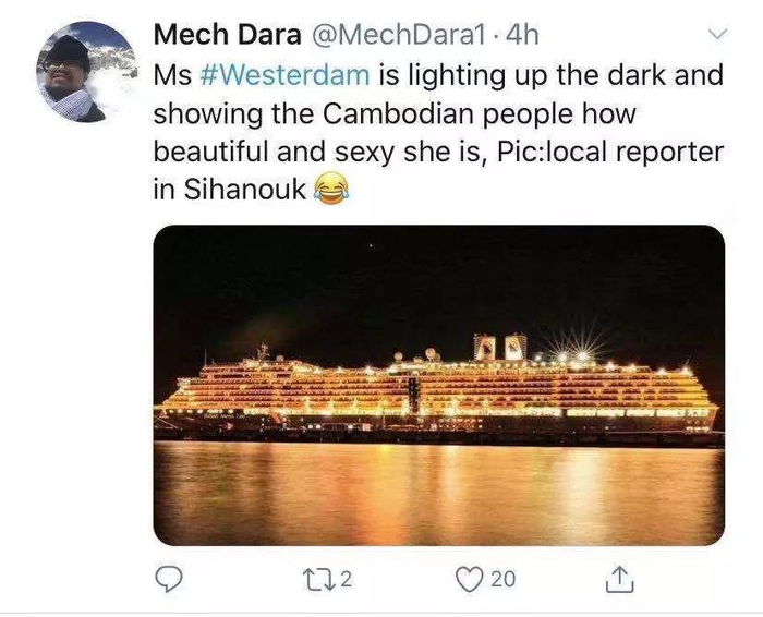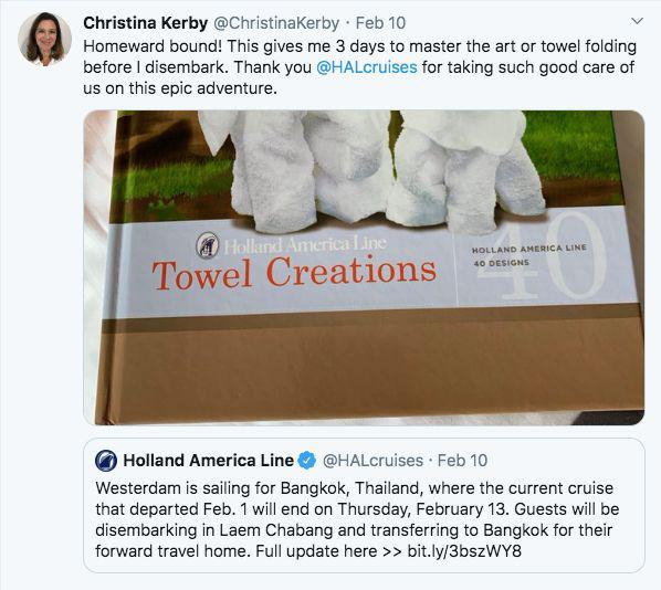 而当天,还传来了另一个好消息,威士特丹号终于“有人要”了。Christina在推特上高兴的写到:返航了!我们将前往柬埔寨,船长告诉我们可能需要几天的时间才能让所有人乘坐包机飞往金边然后回家。非常高兴明天终于能登上陆地了,在那之前我要继续研究我的毛巾动物。晚上乘客们开派对庆祝。