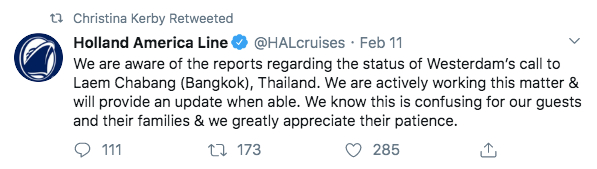 2月11日:泰国方面传来了可能不接受威士特丹号停靠的消息。荷美公司也在第一时间告知乘客,正在与泰国当面协调。