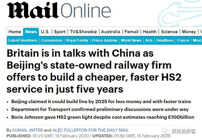 《每日邮报》:中国铁路总公司提出在2025年之前,建成速度更快、价格更便宜的英国高铁