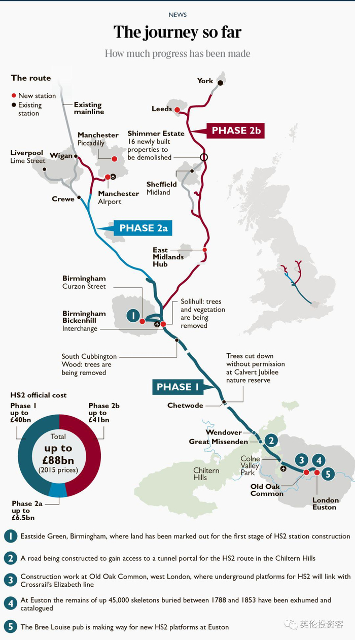 英国高铁总长531公里,建造成本高达1060亿英镑,预计2040年通车。