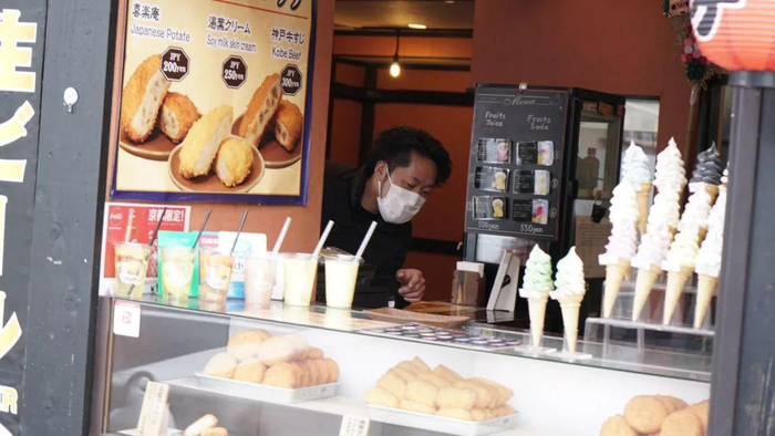 清水寺门前的一家小店,生意冷清了许多,店员都戴上了口罩