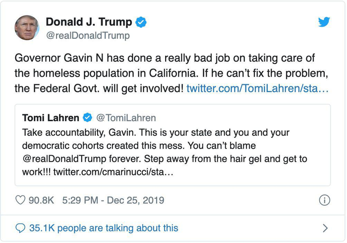 特朗普在一系列圣诞节推文中指责加州州长:“州长加文·纽森在照顾加州无家可归者方面做得非常糟糕。如果他不能解决问题,联邦政府将介入其中!”虽然特朗普的言论招来了很多批评,但也不乏支持者,比如前加州州长,好莱坞巨星施瓦辛格。他在最近接受媒体采访时,感谢特朗普直面加州的“流浪者危机”。