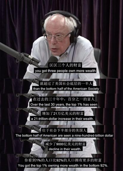 施瓦辛格说,在加州硅谷附近地区,一居室每个月租金是2000-3000美元,两居室则是5000美元。谁付得起?不仅如此,加州的环保规定禁止修建新的住房,让低收入者雪上加霜。施瓦辛格说,加州政府采取了一些救助措施,比如给无家可归的人提供移动房屋。在洛杉矶,这样的移动房屋却只有63个,而当地无家可归的人有六万。1%的富人与99%的穷人穷人有多穷,富人就有多富。民主党总统参选人伯尼·桑德斯在参加罗根秀时曾披露了一个震惊的事实:在美国,区区三个人的财富,就超过了美国社会底层的一半人。