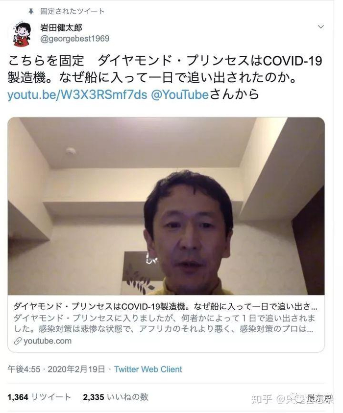 日本神户大学感染科教授岩田健太郎,在YouTube用日英双语实名曝光:“钻石公主号”邮轮内部传染病管理混乱、问题严重,并称钻石公主号是“新冠病毒制造机”。