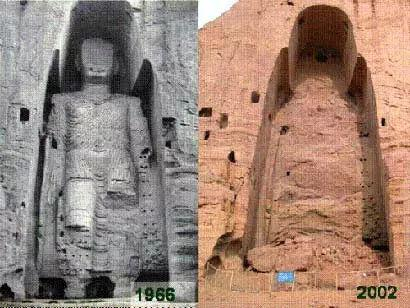 △ 阿富汗巴米扬大佛在2001年3月被当时掌控阿富汗政局的塔利班政权所摧毀。图为巴米扬大佛1966年和被毀后对比。