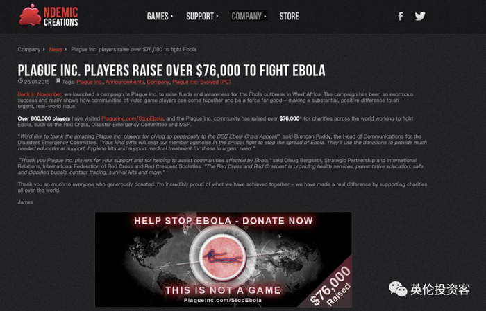 2年后西非埃博拉疫情暴发,这款游戏意外成名。当时,开发商利用游戏平台发起玩家募捐,为慈善组织募集到了7.6万美元,用来帮助抗击埃博拉疫情。