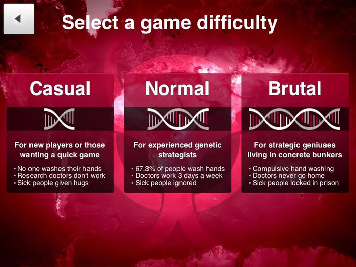 在游戏设定中,玩家有三个大方向可以升级瘟疫:传染性,病毒症状和病毒能力。传染性主要包括各种传播方式和传染的速度,病毒症状则是从最简单的头晕腹泻到致命的贫血,器官损害等,也就是你病毒的杀伤力,而病毒的能力则是决定了你病毒的存活能力,例如耐寒耐热,对药物的抵抗,以及每种病毒的特殊能力等。