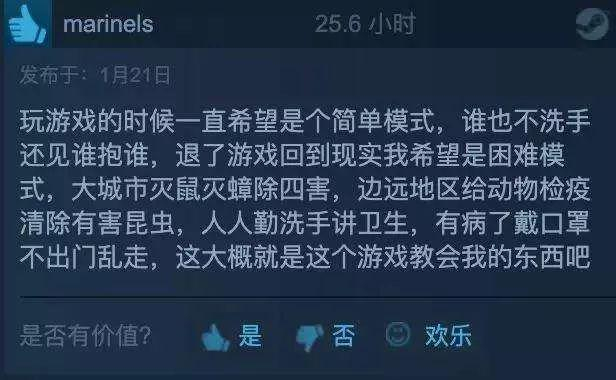 在对游戏MOD的评论中,一位玩家写道:“玩游戏的时候希望是个简单模式(即大家谁也不洗手见谁抱谁开始相互传播),但退了游戏回到现实却希望是困难模式。”“大城市灭鼠灭蟑四害,边远地区给动物检疫清除有害昆虫,人人勤洗手讲卫生,有病了戴口罩不出门乱走,这大概是这个游戏教会我的东西吧。”