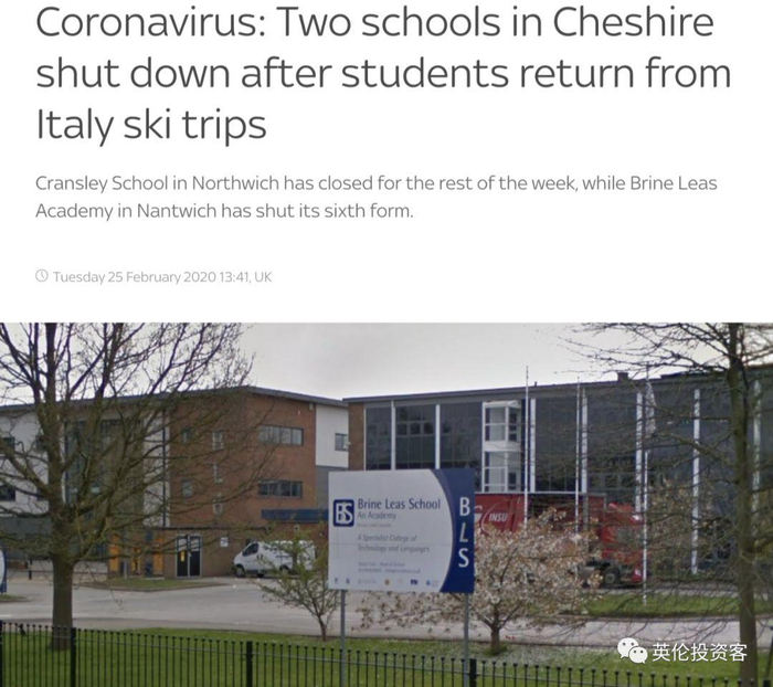 在英国,由于发现学生从意大利滑雪旅行返回,英格兰柴郡紧急关闭了两所学校。根据英国卫生部的最新通知,近期所有从意大利北部回到英国的人都必须在家自我隔离2周。