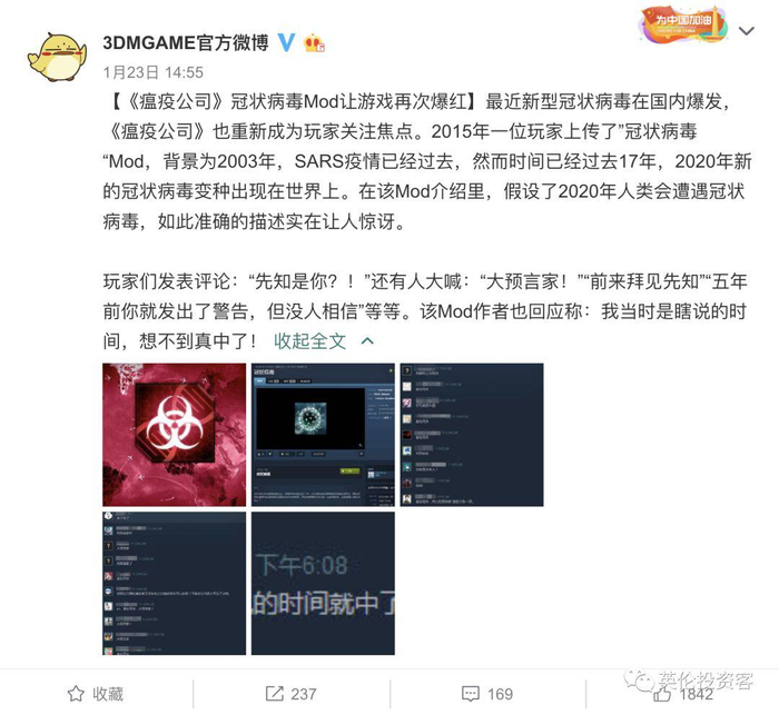 无论是病毒的种类,亦或是时间预测的精准,都让其他玩家们不禁惊叹该作者为预言家,基本跟现在爆发的新冠病毒非常相似。本次疫情发生后,荷兰玩家在推特上评论道:《瘟疫公司》成为现实了(哭)。
