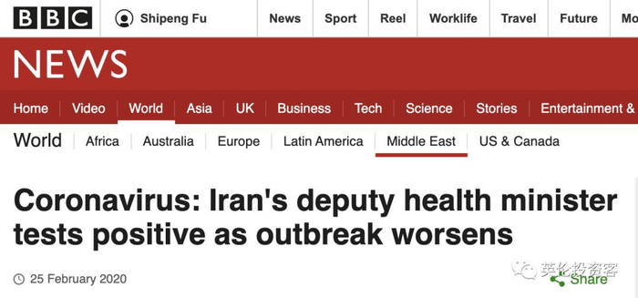 欧洲爆发,中东这边也不好过。伊朗表示,新冠病毒已导致15人死亡,确诊感染人数达到95人。更严重的是,据BBC(2月25日)报道,伊朗卫生部副部长也被确诊感染新冠。