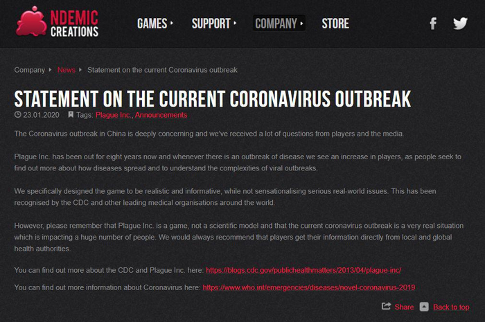 CDC网站介绍“瘟疫公司”游戏的文章而在获悉中国爆发新冠疫情后,英国Ndemic Creations工作室也发表了声明:“中国冠状病毒的爆发令人深感忧虑,我们已经收到了众多玩家和媒体的疑问。”“目前,瘟疫公司已经成立了八年了,每当有传染病爆发时,人们也会寻求更多关于病毒的信息和复杂性,而且参与者也变得更多了。”“我们专门设计出这款游戏,使它更加贴近现实又有丰富的信心,这已经被CDC和其它世界领先医疗组织所认可。”“但是请记住,瘟疫公司只是一个游戏,而不是科学模型,当前的冠状病毒是一个现实的问题并且影响着许多人。”“我们建议玩家还是从本地和全球卫生部门获取最新的信息。”