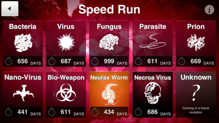 作为一款以传染疾病为题材的策略模拟游戏,《瘟疫公司》可以让玩家体验如何用选定的病原体制造一场全球性的瘟疫。可选的病原体的共有七种,分别是bacteria(细菌)virus(病毒)fungus(真菌)parasite(寄生虫)prion(朊病毒)ano-virus(纳米病毒)和bio-weapon(生化病毒)。在后续更新版本中,英国游戏工作室又补充了虚构的特殊病原体Neurax蠕虫、Necroa病毒、猩猩流感和暗影瘟疫。