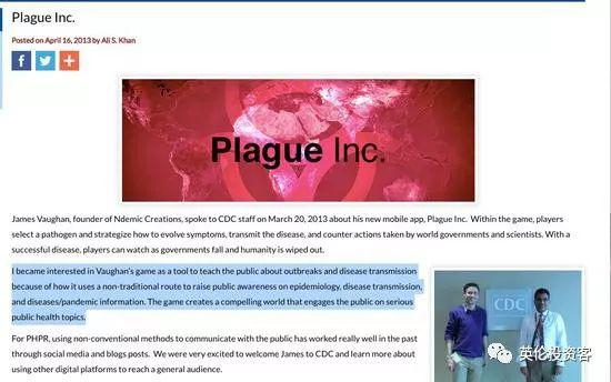 2013年,这款游戏的开发者詹姆斯·沃恩受到美国疾病控制与预防中心(CDC)的邀请出席一个讲座,聊了聊“瘟疫公司”背后的故事。