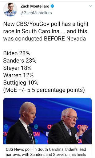 CBS的南卡州民调显示拜登微弱领先桑德斯。