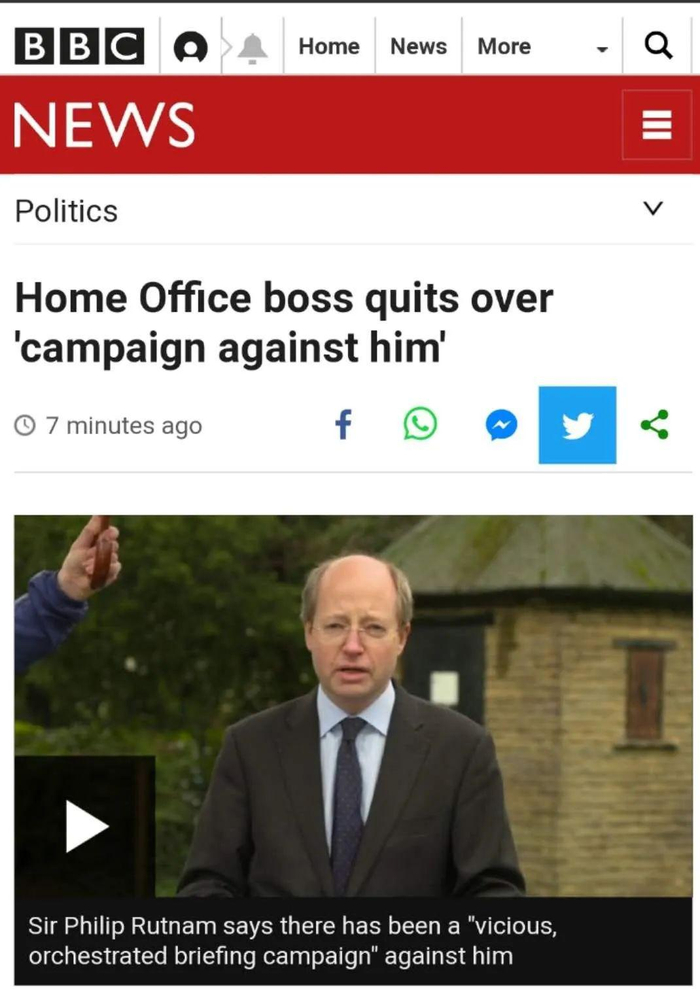 炒作多日的英国内政部大内斗再出重磅新闻!刚刚,Home office大老板、内政部常务次长路特曼爵士(Sir Philip Rutnam)突然通过BBC发布辞职声明,他说,在内政大臣普里蒂·帕特尔的办公室里,过去十天,他一直是一场“恶毒和精心策划的”运动的目标。职业生涯长达33年的他将起诉政府。英媒称,这么高级别的公务员辞职,在英国是史无前例的。